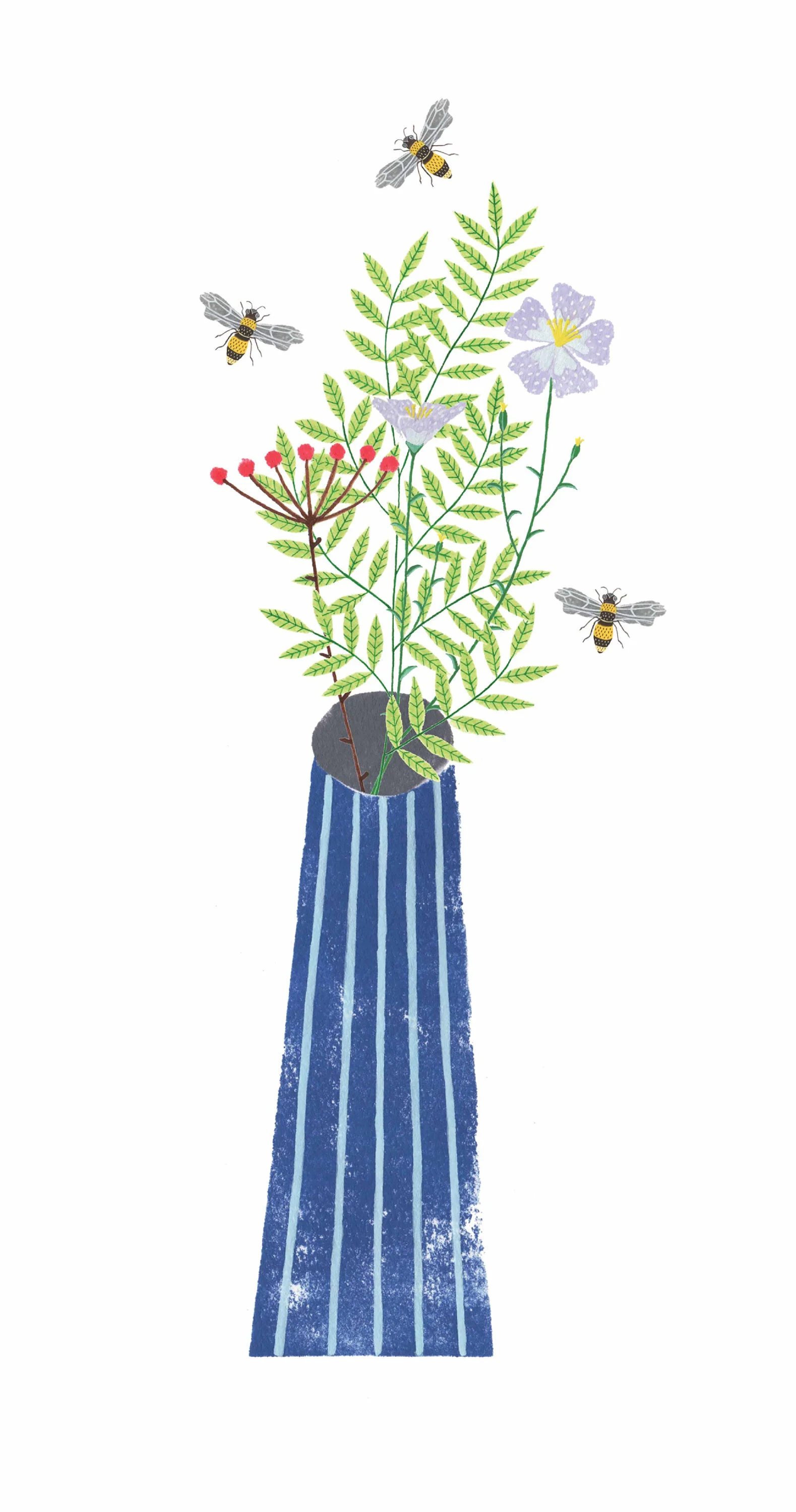 An DL size greetings card with a print of a gouache and ink stamp illustration of a vase of flowers with flying bees