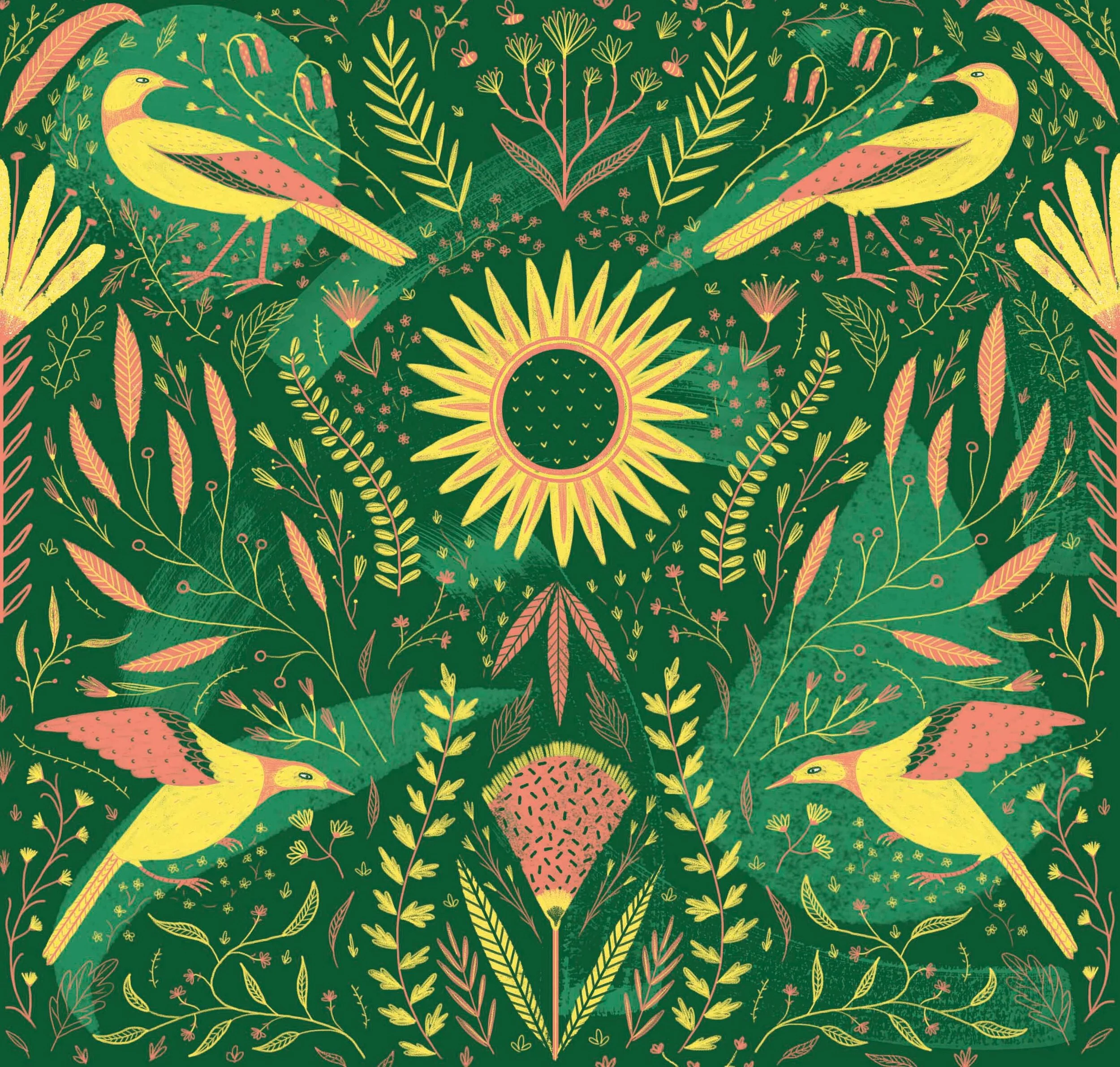 A vibrant take on a blackbirds nest - grey gouache and yellow ink stamp are used to create this birds nest repeat.